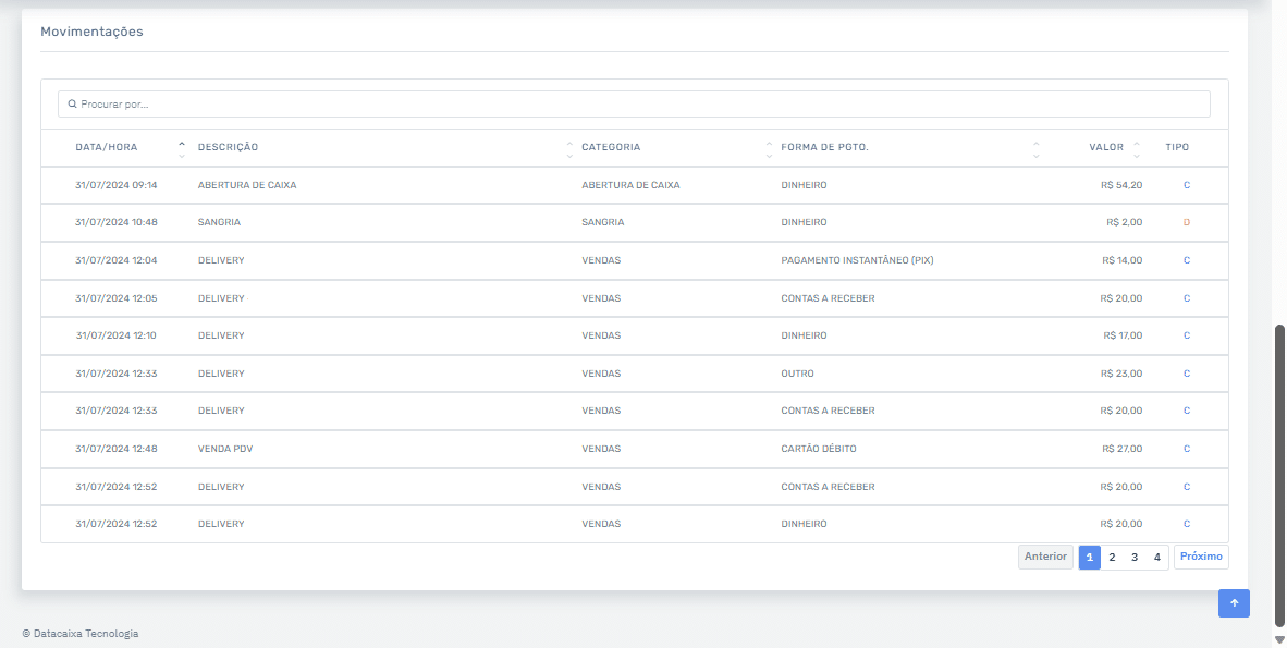 - Categoria: Classifica a operação em diferentes categorias, como Abertura de Caixa, Suprimentos, Sangria e Vendas.