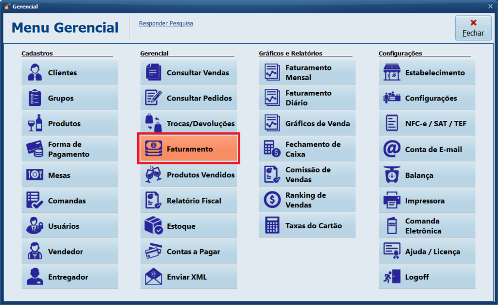 1- Acesse o Menu Gerencial e clique em Faturamento.