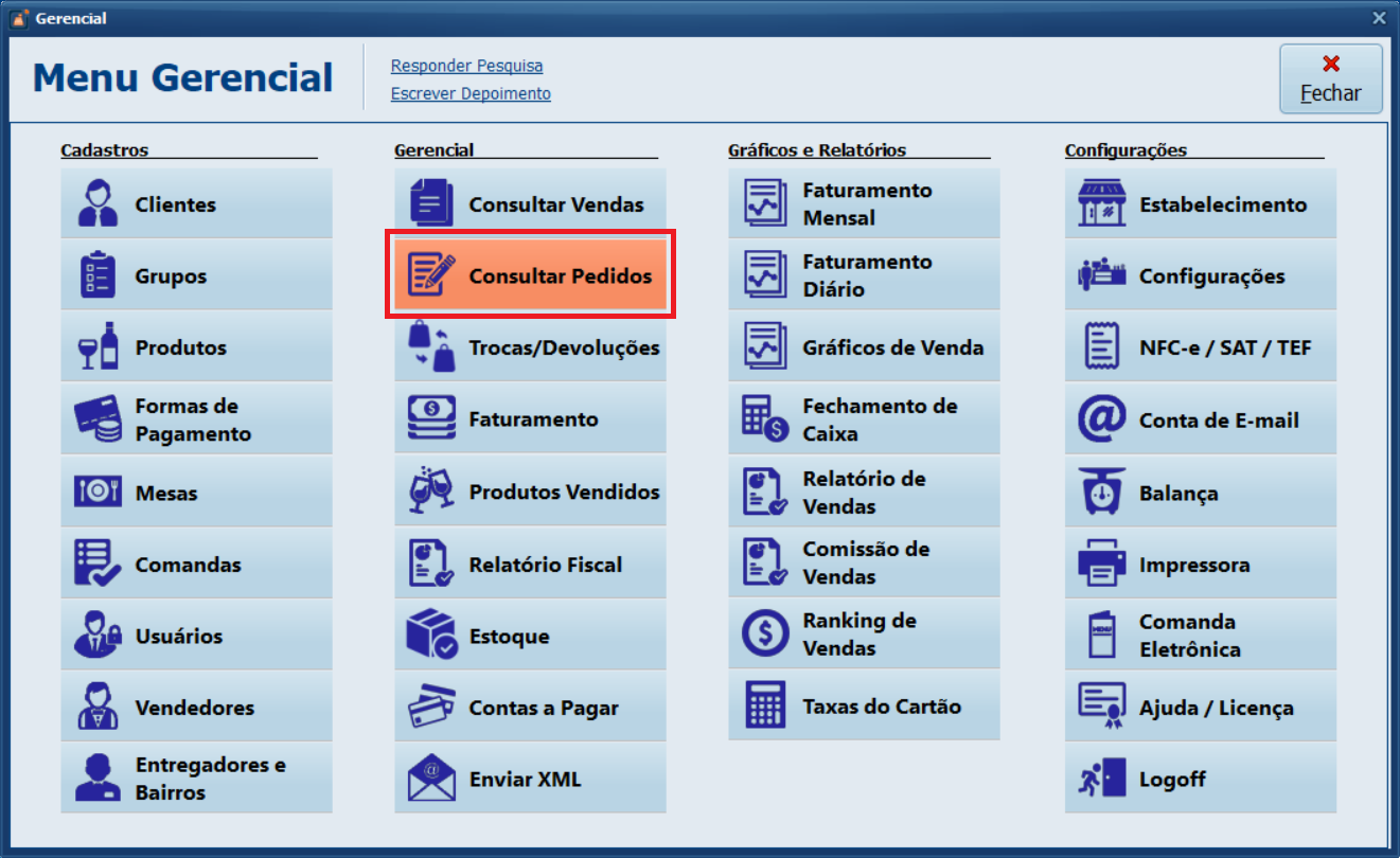 1- Acesse Menu Gerencial > Consultar Pedidos.