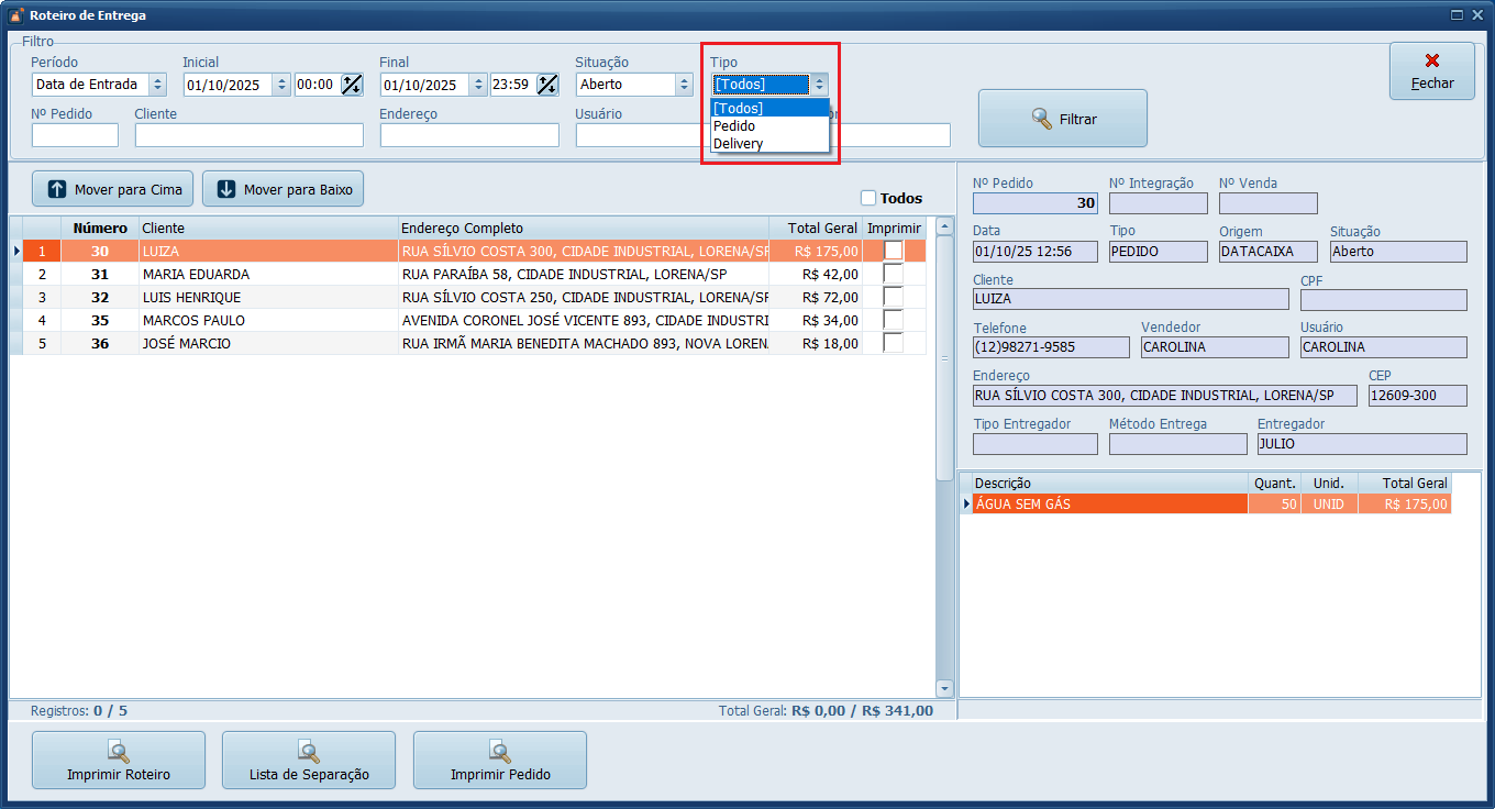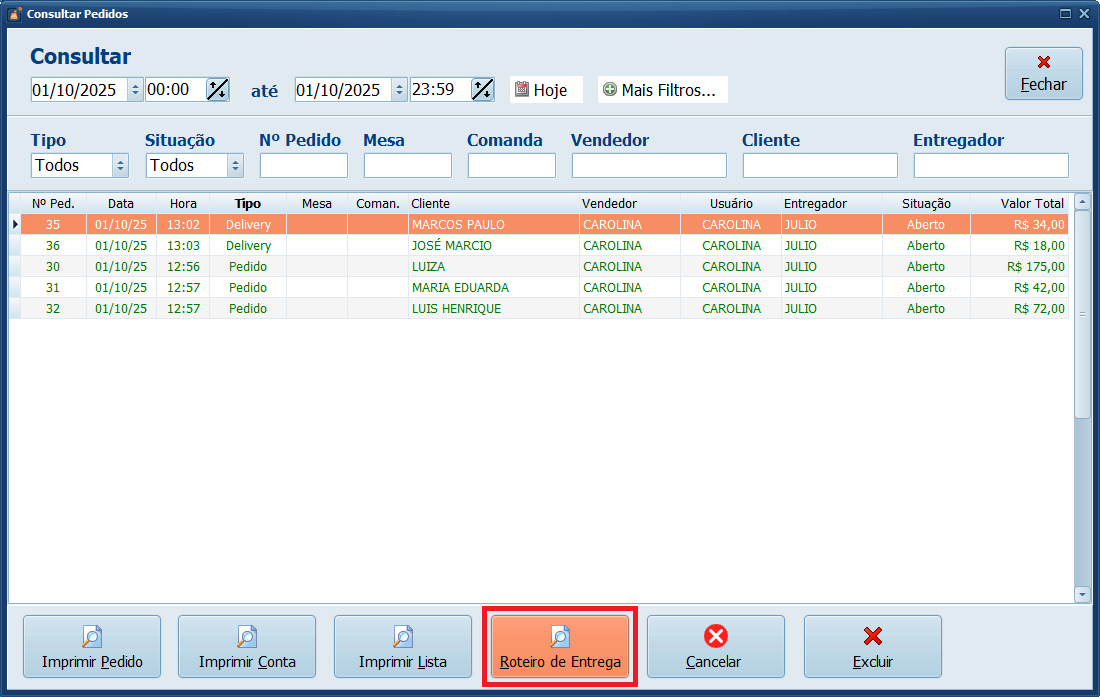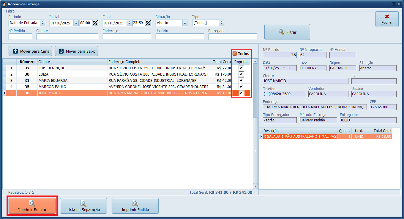 8- Na coluna Imprimir, selecione os pedidos desejados ou marque a opção Todos para incluir todos os registros. Em seguida, clique em Imprimir Roteiro.