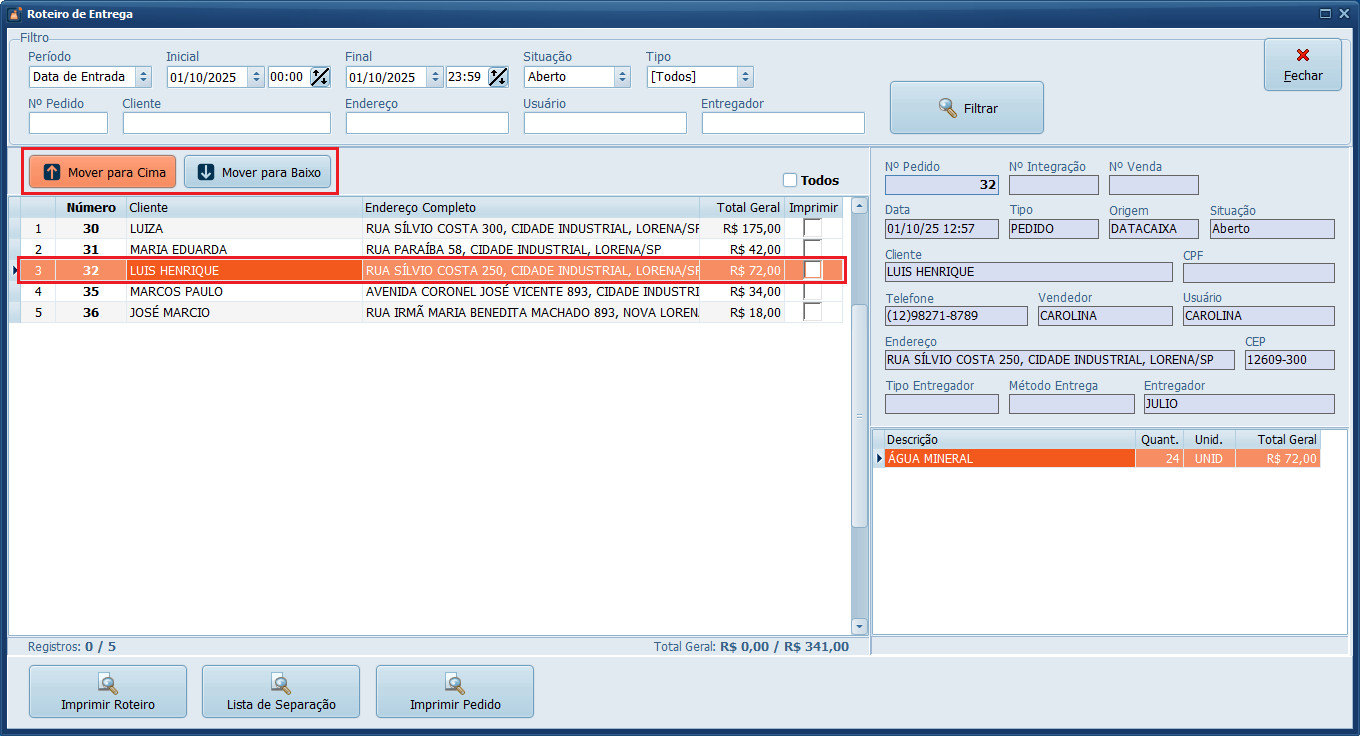 7- Selecione o registro desejado e clique em Mover para Cima ou Mover para Baixo para ajustar a sequência de entrega.
