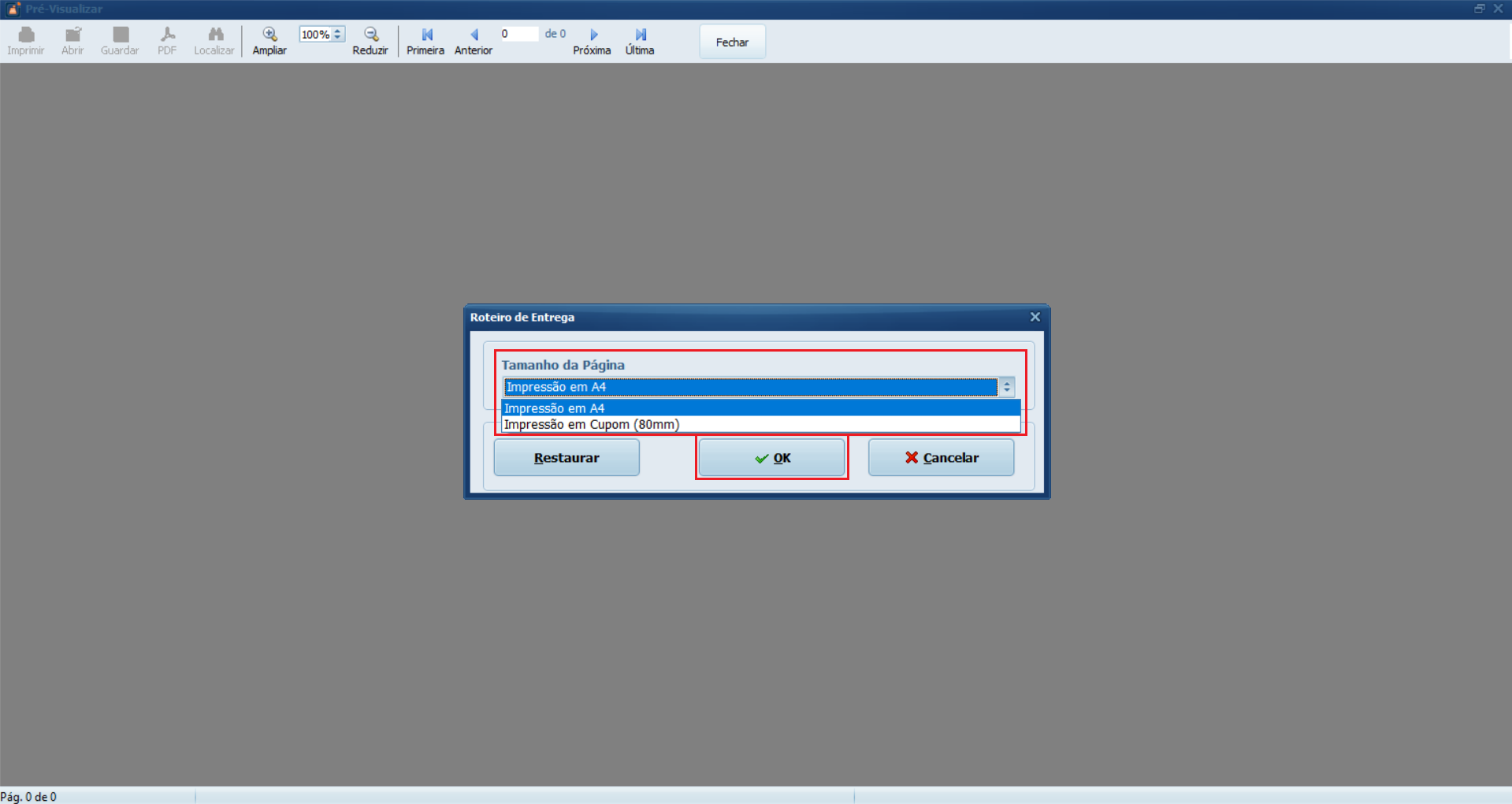 9- Em Tamanho da Página, selecione o formato desejado: Impressão em A4 ou Cupom (80mm), conforme sua preferência. Depois clique em OK.