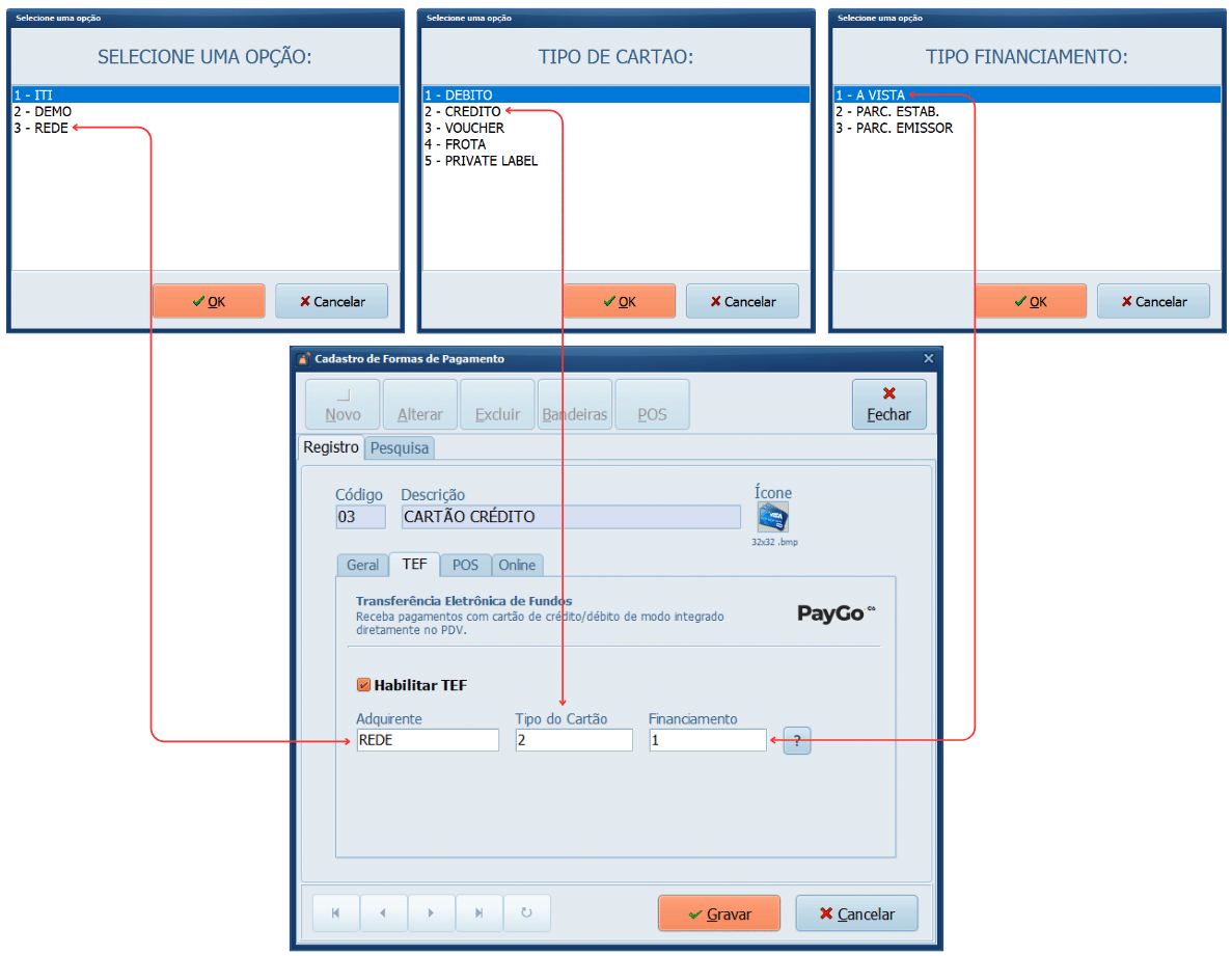 3- Clique na aba TEF, preencha os campos: Adquirente, Tipo do Cartão e Financiamento com a opção que deseja sempre utilizar e clique em Gravar.