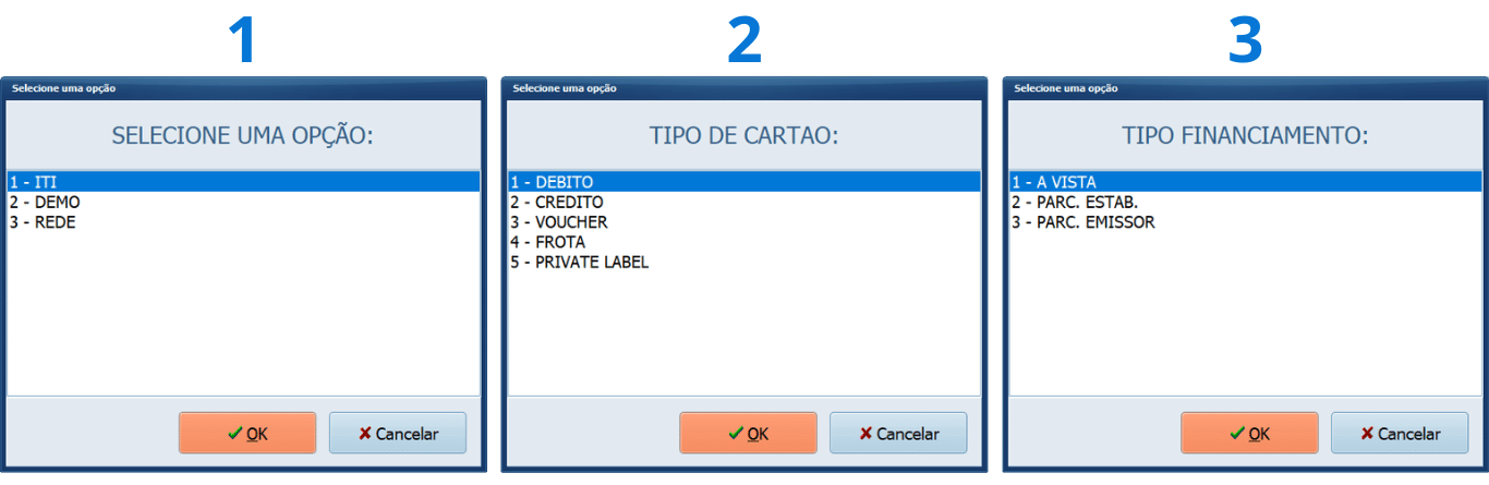 Para saber o nome ou o código basta consultar nas opções que são solicitadas durante a transação com TEF, conforme o exemplo abaixo: