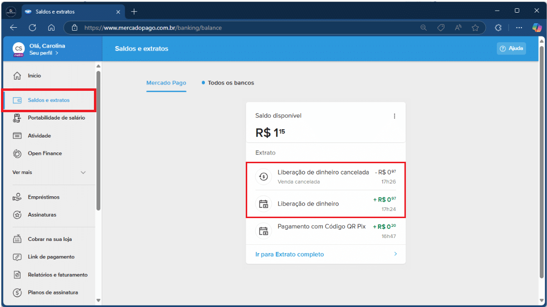 1- Realize login na sua conta do Mercado Pago, depois clique em Saldos e extratos.