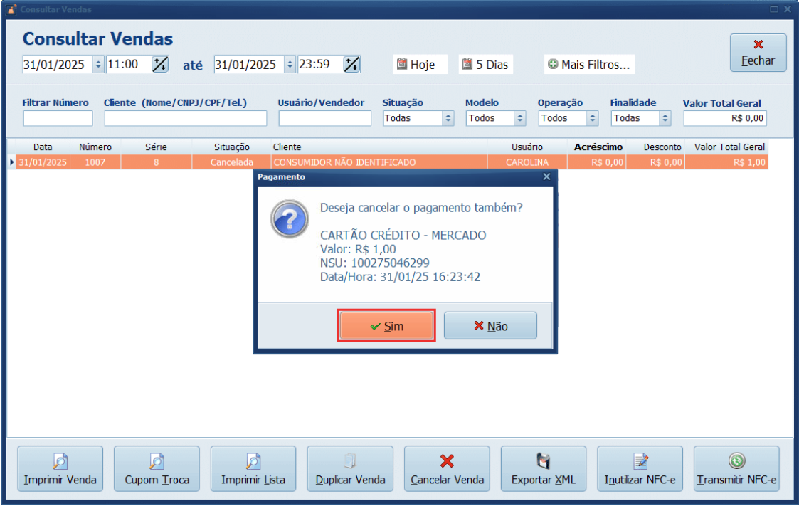 Pronto! A venda foi cancelada no Sistema e o pagamento estornado ao cliente com sucesso.