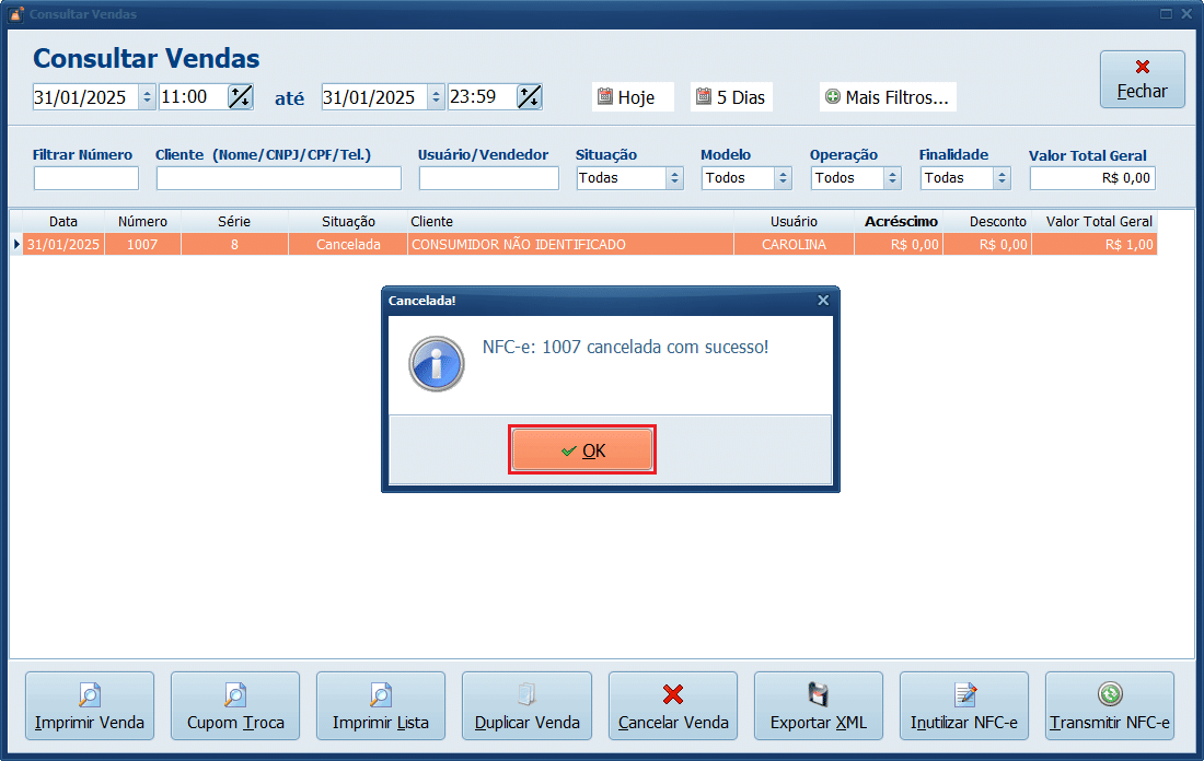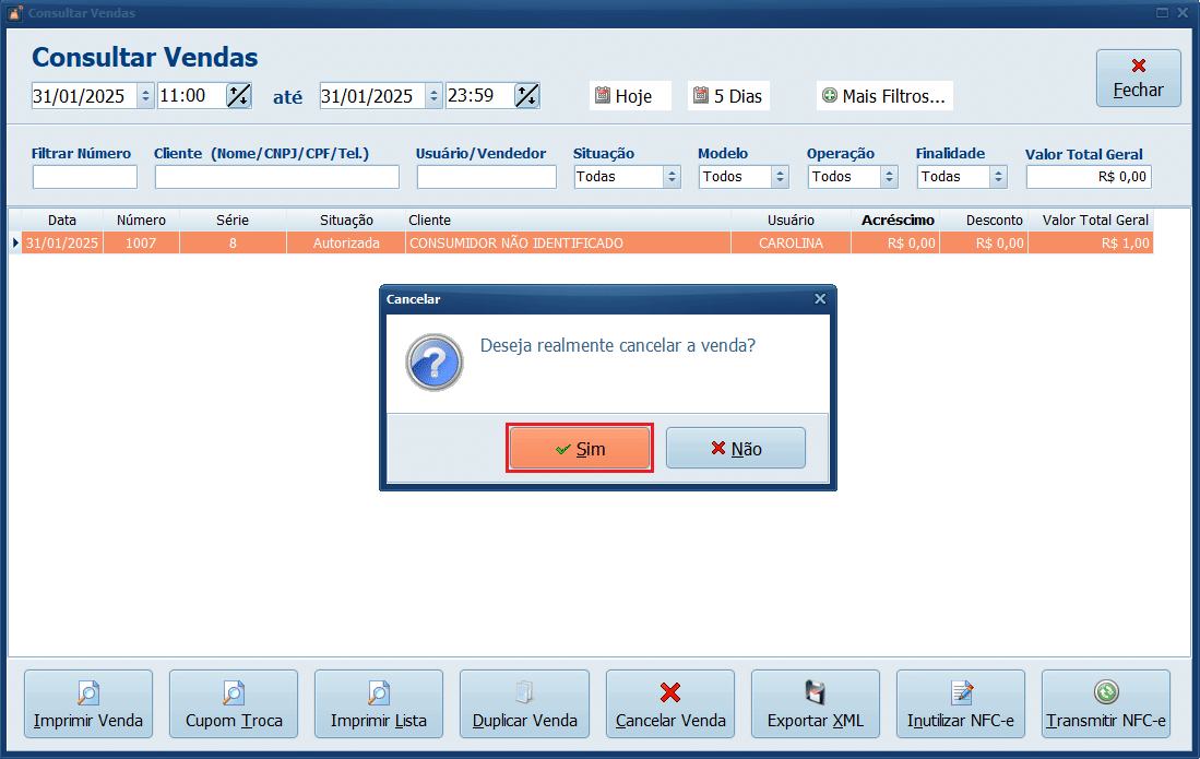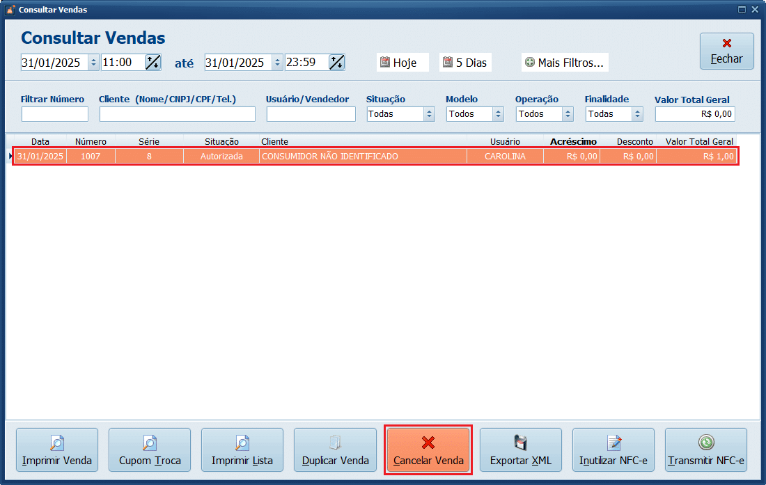 2- Selecione o registro e clique em Cancelar Venda.