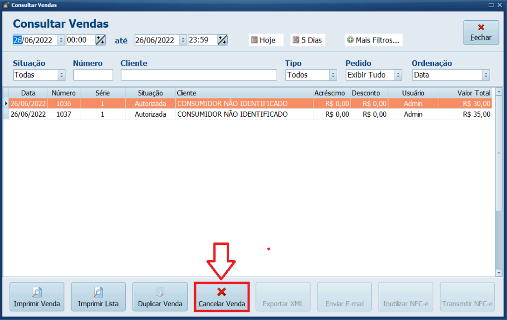 2- Selecione a venda e clique em Cancelar Venda.