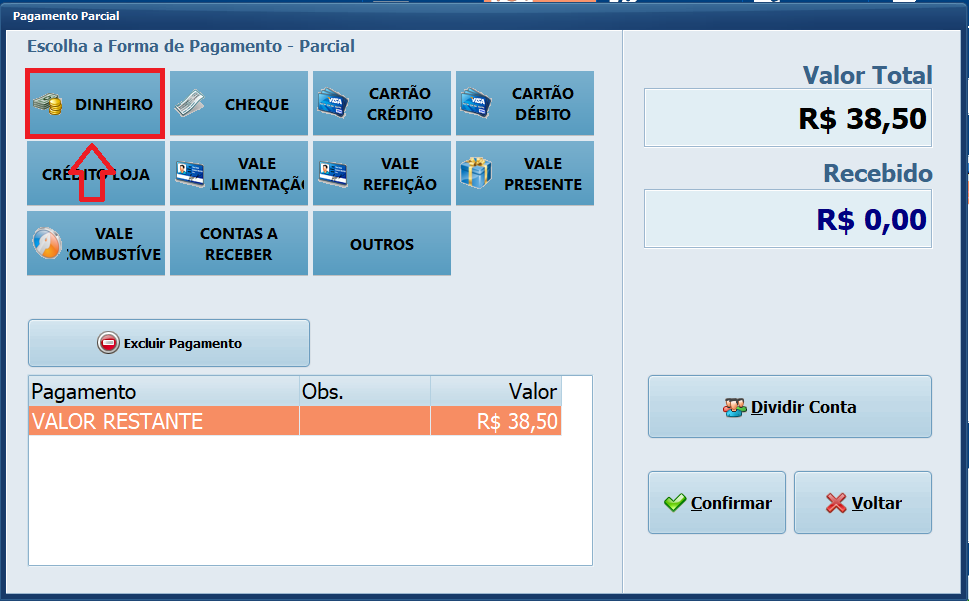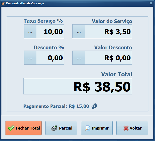 Caso precise dividir o pagamento entre mais pessoas continue utilizando o Parcial e Feche o Total somente no pagamento da última pessoa.