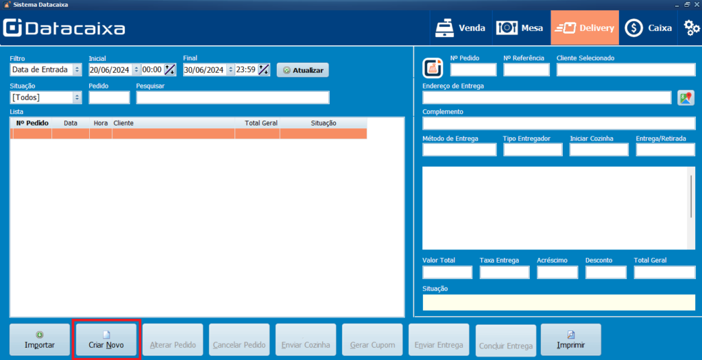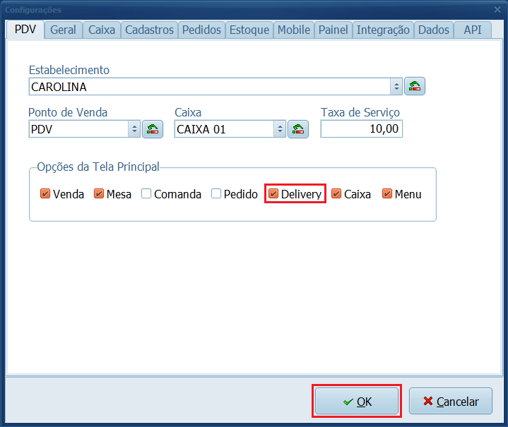 3- Habilite o parâmetro Delivery nas Opções da Tela Principal e clique em OK.