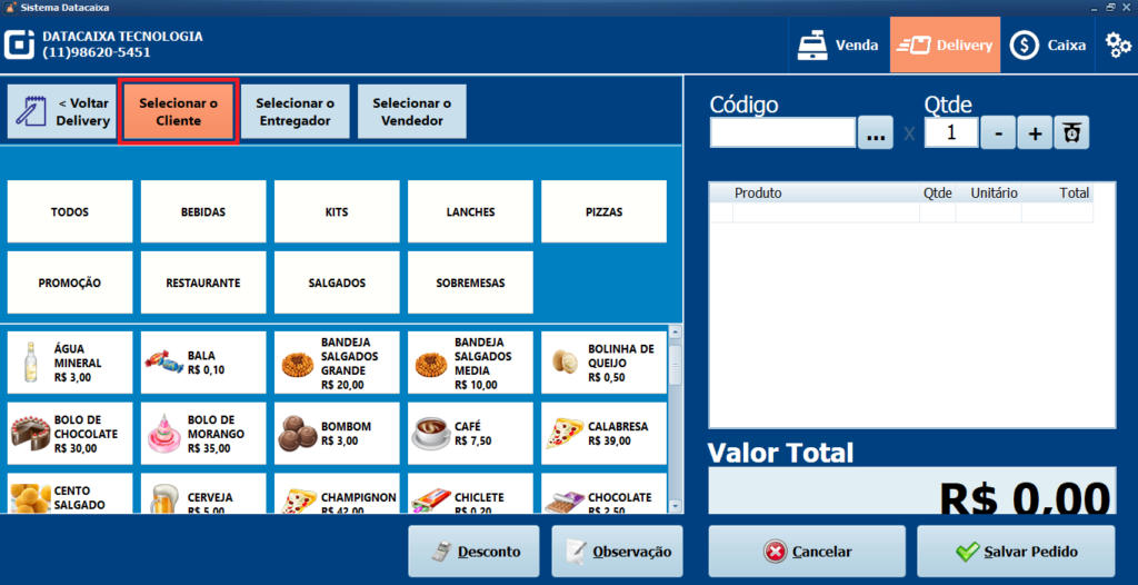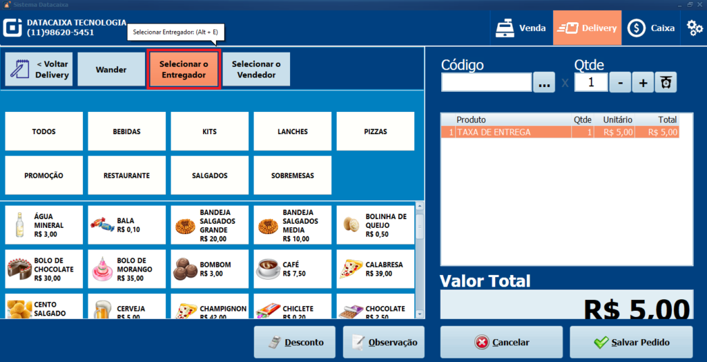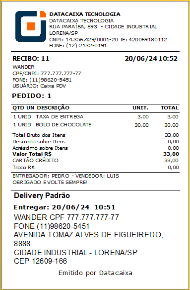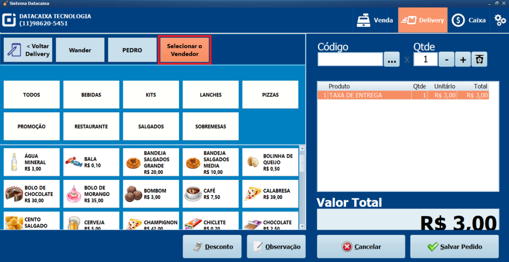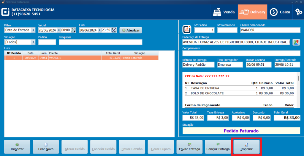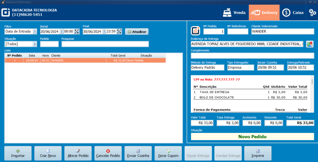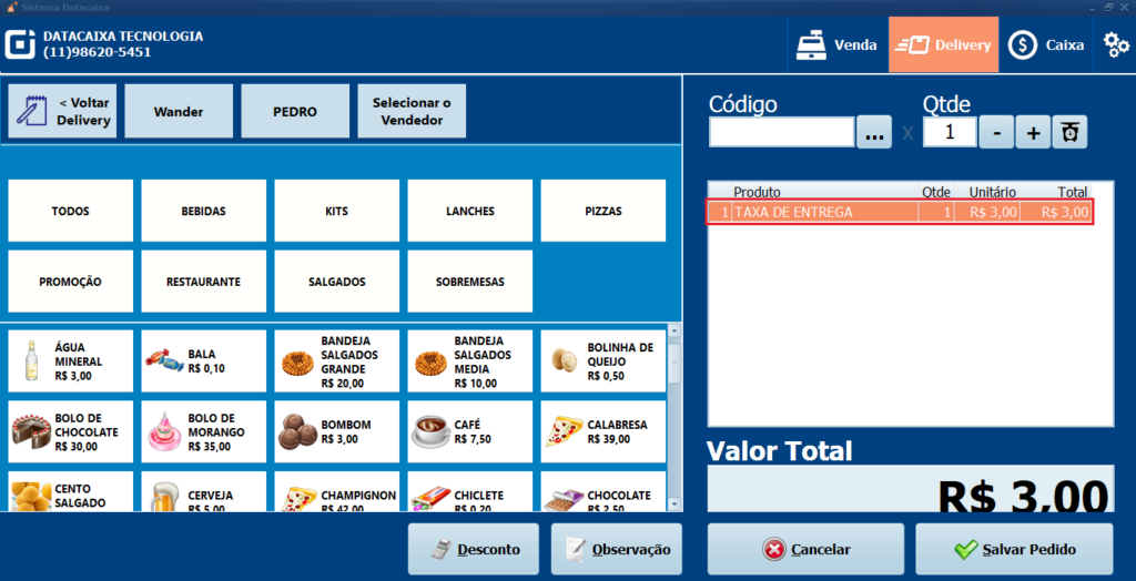 9- Ao selecionar o Cliente verifique que registrou a TAXA DE ENTREGA conforme a atualização no Passo 4.
