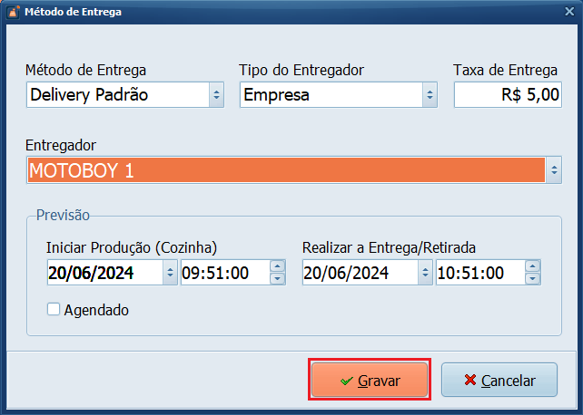 11- Selecione o Entregador e clique em Gravar, nesta janela é possível atualizar o valor da Taxa de Entrega e também ajustar a previsão de Entrega/Retirada em Realizar a Entrega/Retirada.