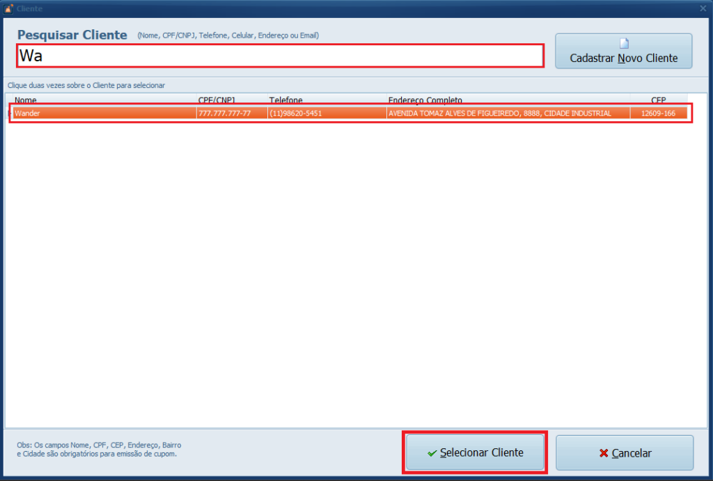 8- Caso precise, use a barra de busca para localizar com mais facilidade, selecione o cliente e clique em Selecionar Cliente, caso ainda não tenha cadastro, clique em Cadastrar Novo Cliente.