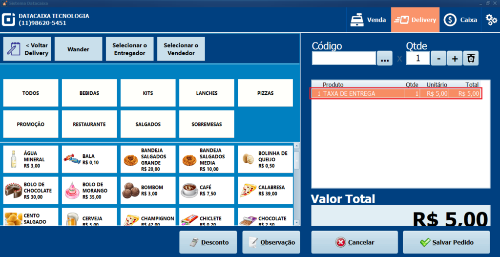 12- Exemplo após atualizar o valor da TAXA DE ENTREGA.