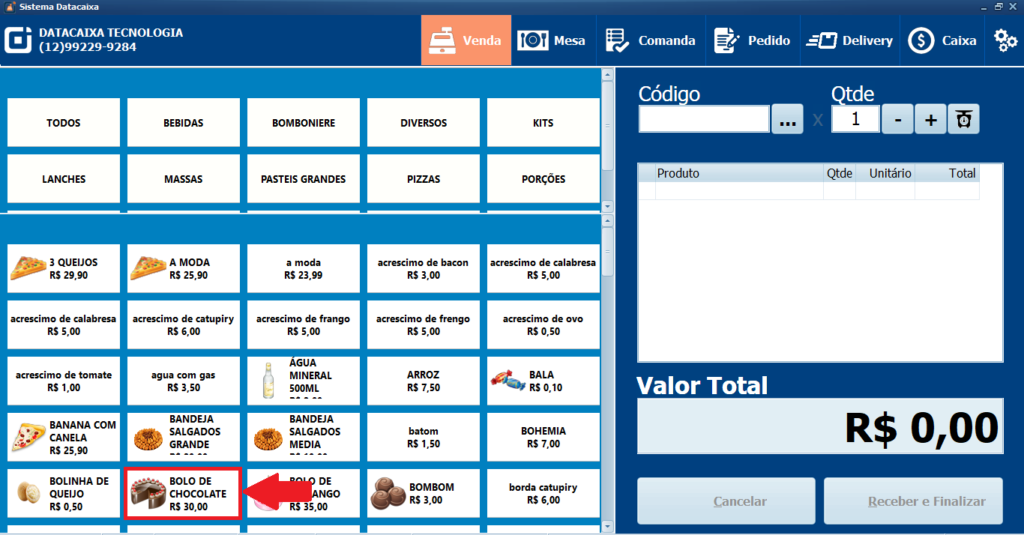 1- Com a opção de Venda selecionada > Escolha um ou mais Produtos, neste exemplo selecionamos o Bolo de Chocolate.