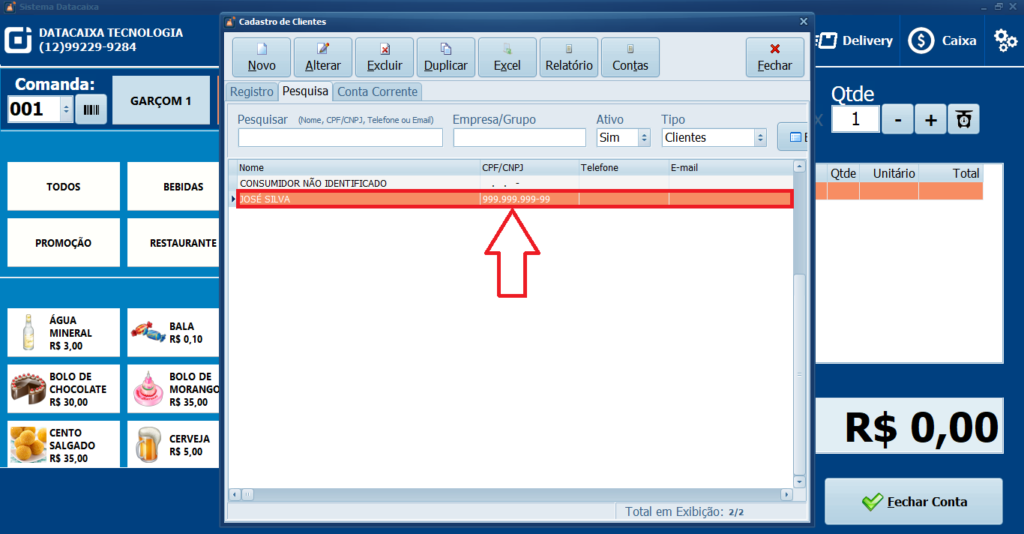 7- Dê um duplo clique no Cliente escolhido, é possível cadastrar um novo clicando em Novo.
