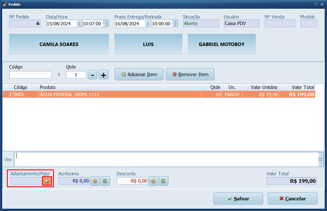 12- Clique no botão destacado em Adiantamento/Pgto.