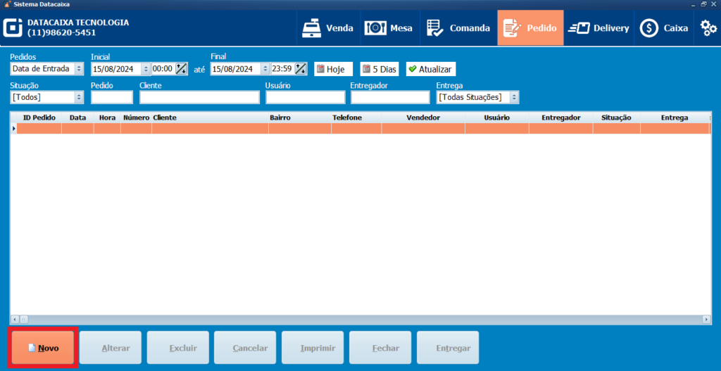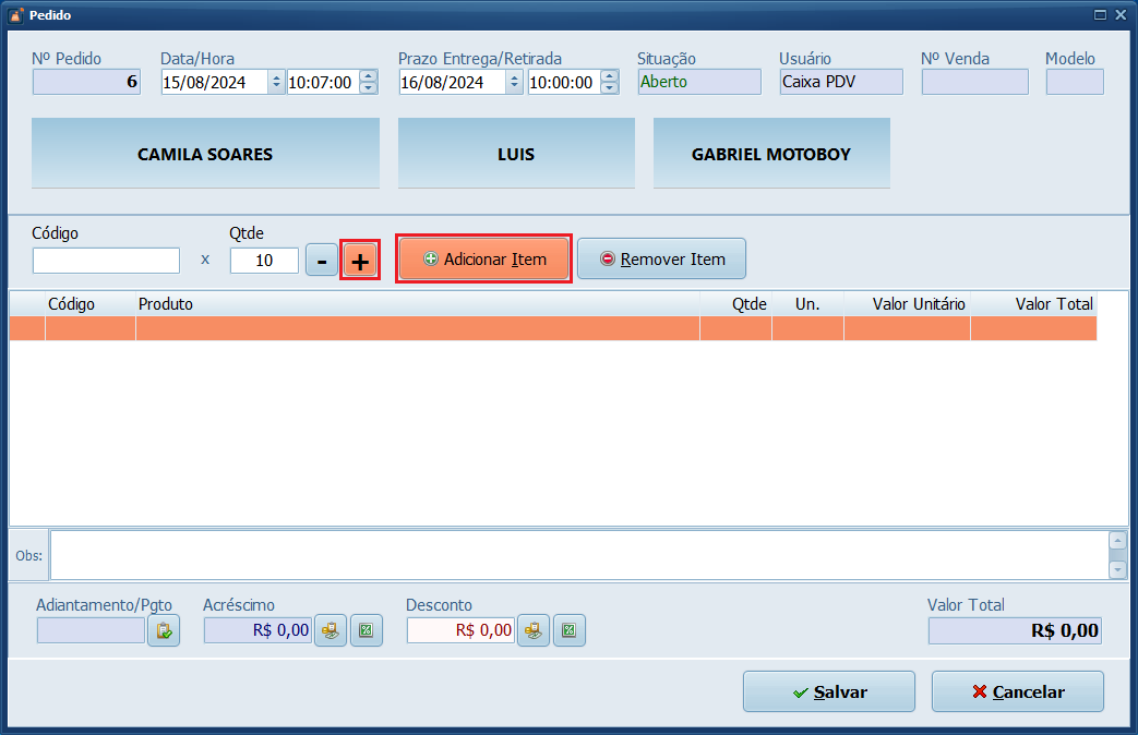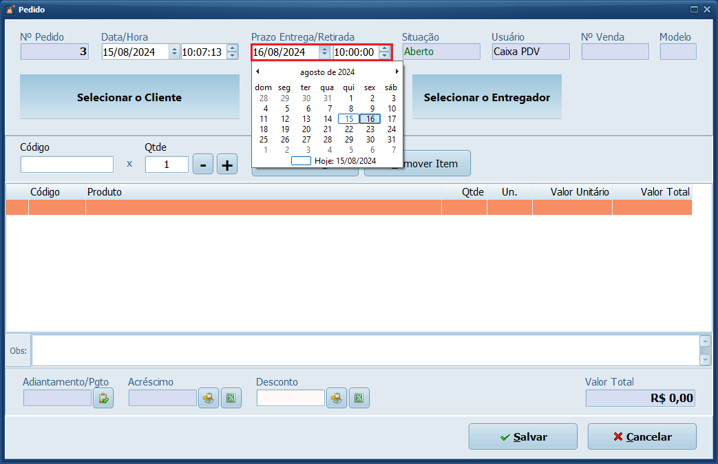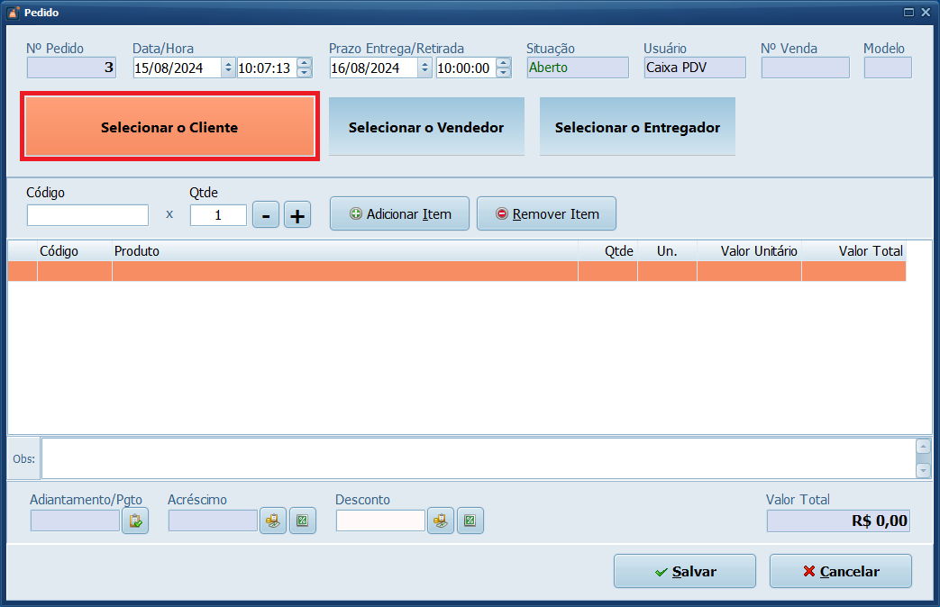 1- No sistema PDV, clique em Pedido.