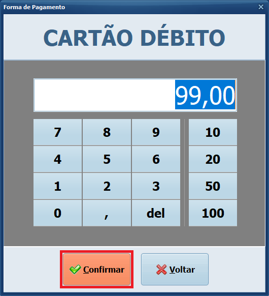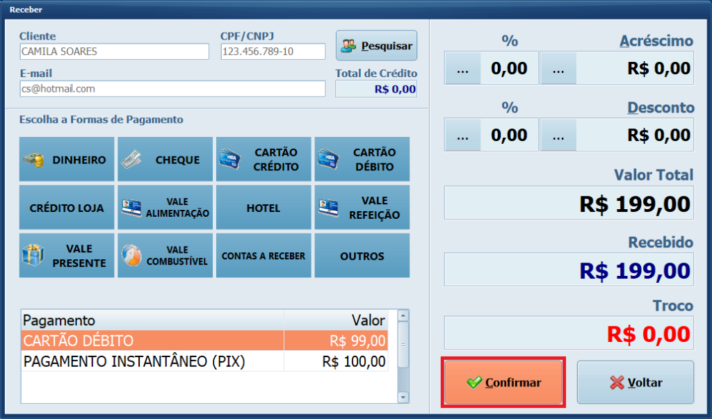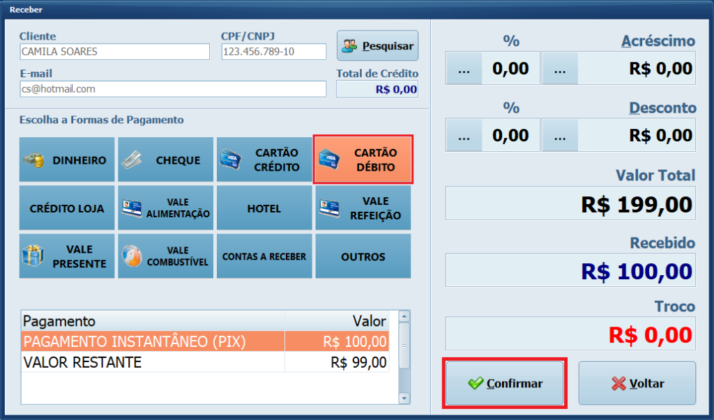 19- Selecione a forma de pagamento para o restante do valor que o cliente irá pagar. Em seguida, clique em Confirmar.