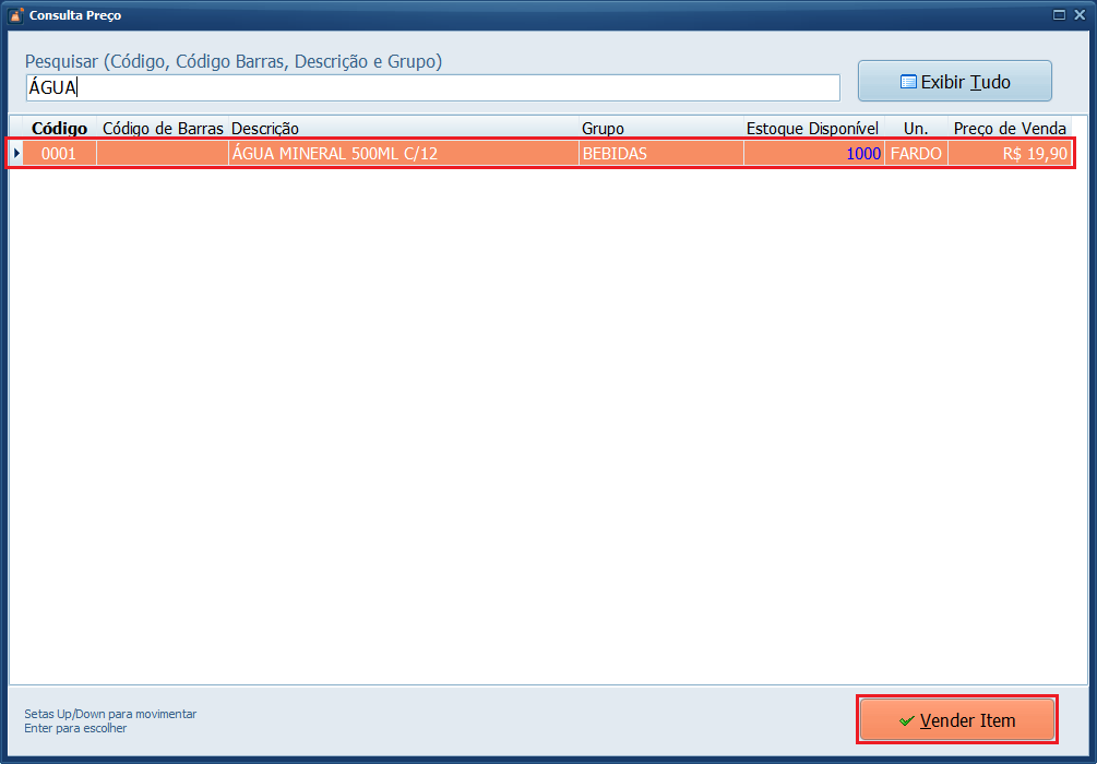 11- No campo Pesquisar, digite o nome do produto para facilitar a busca e selecione o registro. Em seguida, clique em Vender Item.