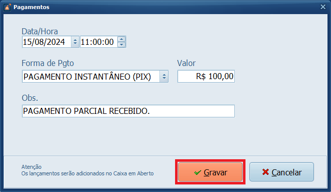 14- Informe os detalhes do pagamento e clique em Gravar.