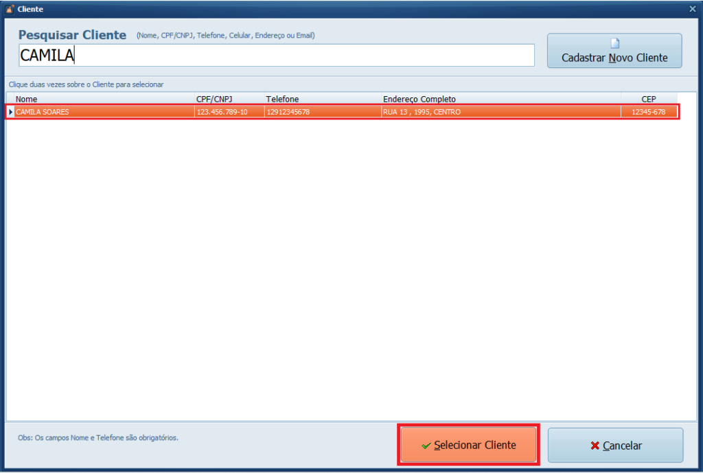 5- No campo Pesquisar Cliente, digite o nome para facilitar a busca e selecione o registro, logo após clique em Selecionar Cliente.