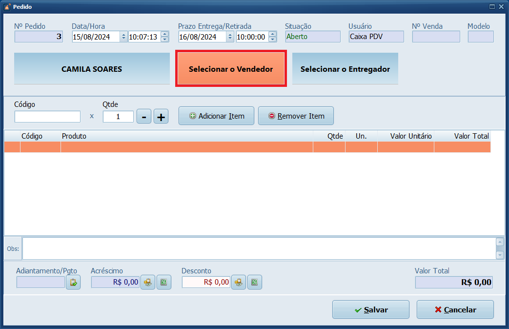 7- Em seguida, selecione o vendedor responsável.